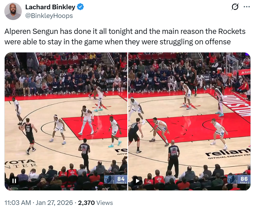 面对申京这样的表现,火箭记者Lachard Binkley连发数条推特称赞申京。