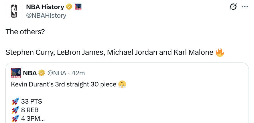 同时本场是杜兰特在生涯18个赛季第17次砍下30+,继续高居NBA历史第一,远超第二名詹姆斯的9次与第三名马尔卡龙的7次。
