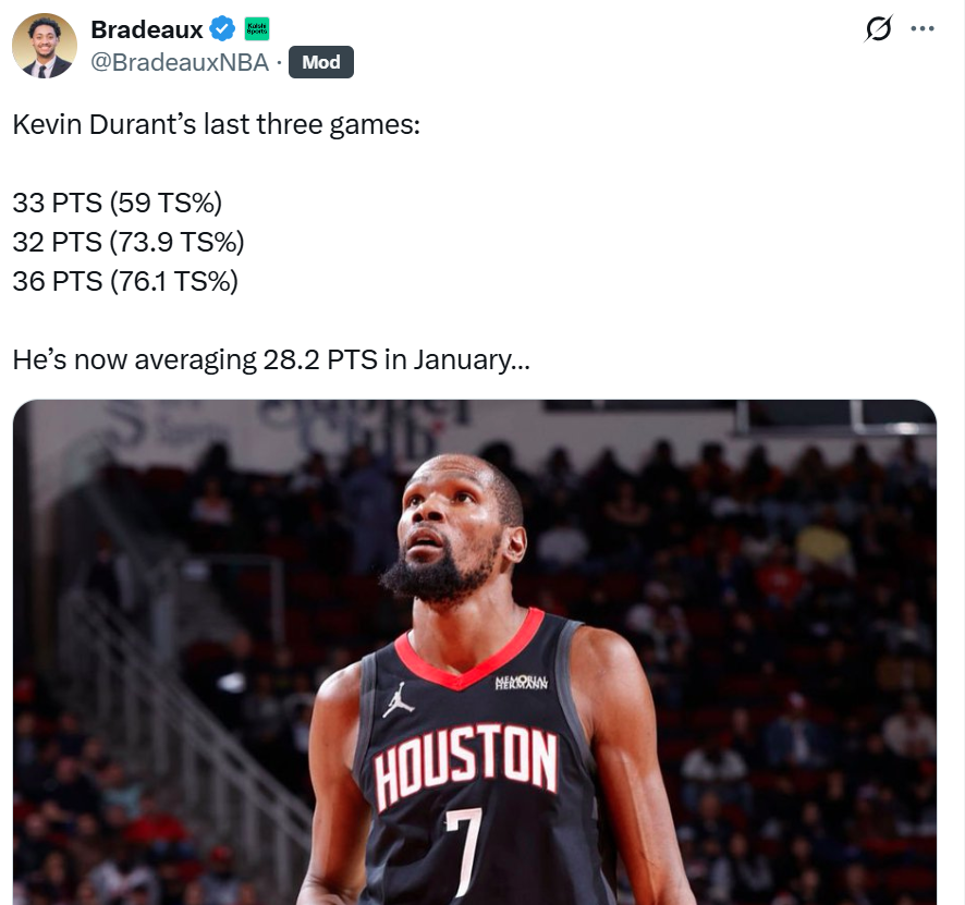 之所以要依靠申京维持局面,主要原因是杜兰特上半场手感不佳,好在他下半场找回状态连中三分收割胜利。